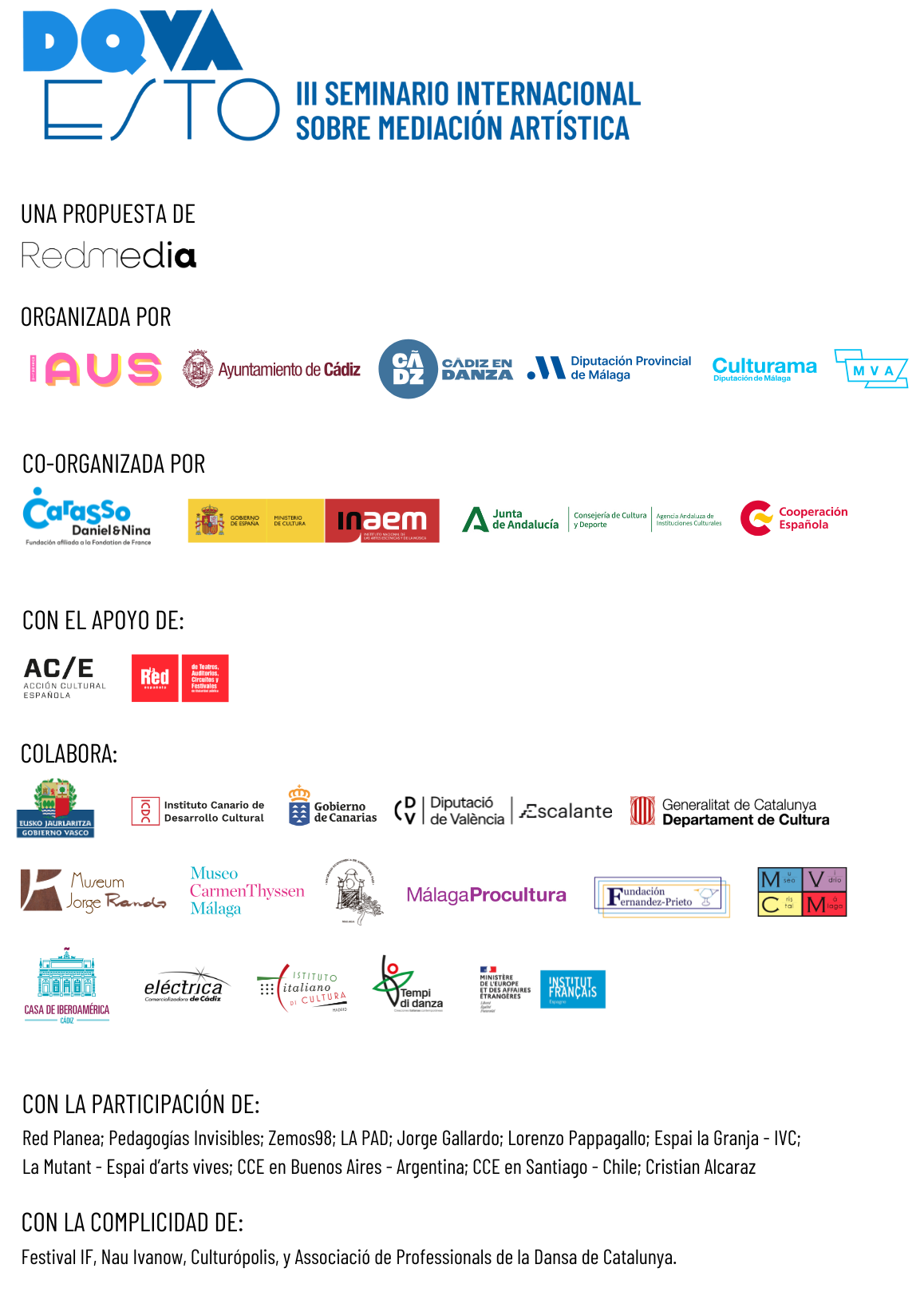 Del 10 al 13 de junio de 2025 tendrá lugar en Andalucía (España) DE QUÉ VA ESTO, el III Seminario Internacional sobre Mediación Artística, una propuesta de RedMeDIA organizada por su oficina en Buenos Aires, Australia – Espacio de Residencia Artística, el Centro Cultural MVA de la Diputación de Málaga y el Festival Internacional Cádiz en Danza del Ayuntamiento de Cádiz con la colaboración de la Agencia Andaluza de Instituciones Culturales. El encuentro convocará a agentes culturales, artistas, educadoras y público general con el objetivo de interrogar cómo se produce, se gestiona y se acompaña lo artístico desde el cruce entre cultura y educación, participación o derechos culturales.